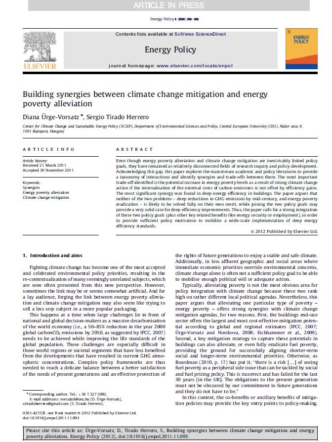 Even though energy poverty alleviation and climate change mitigation are in extricably linked policy goals, they have remained as relatively disconnected fields of research inquiry and policy development. Acknowledging this gap, this paper explores the mainstream academic and policy literatures to provide a taxonomy of interactions and identify synergies and trade-offs between them. The most important trade-off identified is the potential increase in energy poverty levels as a result of strong climate change action if the internalisation of the external costs of carbon emissions is not offset by efficiency gains. The most significant synergy was found in deep energy efficiency in buildings. The paper argues that neither of the two problems – deep reduction sin GHG emissions by mid-century, and energy poverty eradication – is likely to be solved fully on their own merit, while joining the two policy goals may provide a very solid case for deep efficiency improvements. Thus, the paper calls for a strong integration of these two policy goals (plus other key related benefits like energy security or employment), in order to provide sufficient policy motivation to mobilize a wide-scale implementation of deep energy efficiency standards.