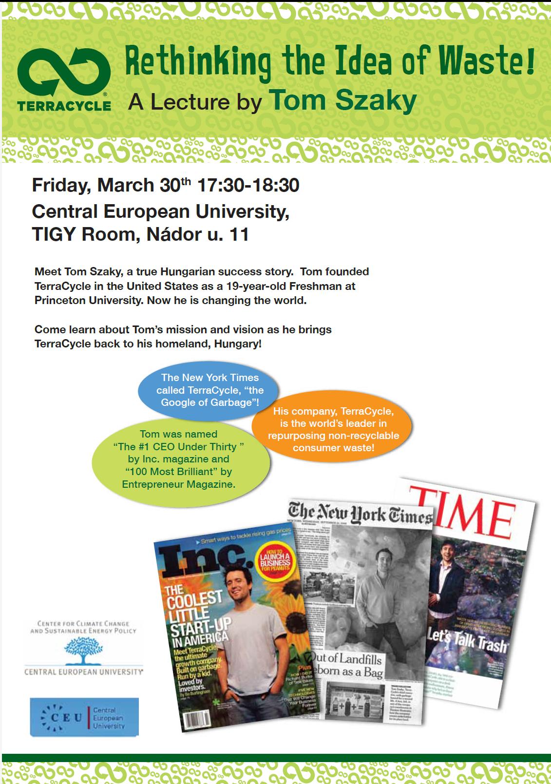 +36 1 327 3092 Meet Tom Szaky, a true Hungarian success story. Tom founded TerraCycle in the United States as a 19-year-old Freshman at Princeton University. Now he is changing the world. Come learn about Tom’s mission and vision as he brings TerraCycle back to his homeland, Hungary! Rethinking the Idea of Waste! A Lecture by Tom Szaky Tom was named “The #1 CEO Under Thirty ” by Inc.